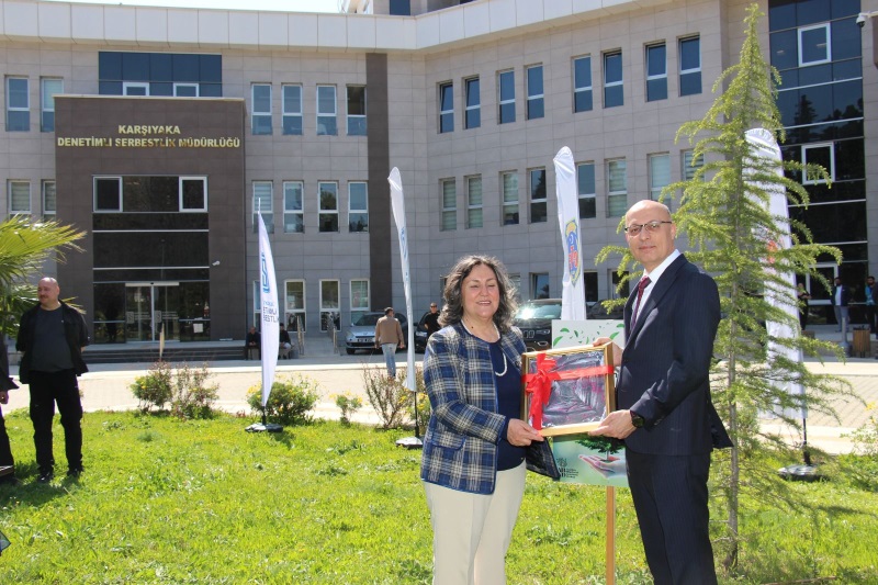 Program kapsamında, ABAD Derneği Başkanı Sayın Ayşe Figen Tan’a plaket ve Karşıyaka Denetimli Serbestlik Müdürlüğü sanat atölyesindeki yükümlülerce yapılan Ebru tablosu hediye edildi. Ardından protokol üyeleri ve personellerin katılımıyla fidanlar toprakla buluşturuldu.